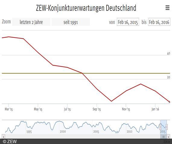 ZEW-KonjunkturerwartungenDie ZEW-Konjunkturerwartungen für Deutschland gehen im Februar 2016 zum zweiten Mal in Folge zurück. Der Index verliert gegenüber dem Vormonat 9,2 Punkte und steht jetzt bei 1,0 Punkten (langfristiger Mittelwert: 24,6 Punkte). "Die sich abzeichnende Abschwächung der Weltkonjunktur und die ungewissen Folgen des Ölpreisverfalls belasten die ZEW-Konjunkturerwartungen. Angesichts dieser Entwicklungen hat die Sorge um erhöhte Kreditausfallrisiken bereits Aktien- und Anleihenkurse vieler Banken in Europa, den USA und Japan in die Knie gezwungen", kommentiert Prof. Dr. Sascha Steffen, Leiter des Forschungsbereichs "Internationale Finanzmärkte und Finanzmanagement" am ZEW.