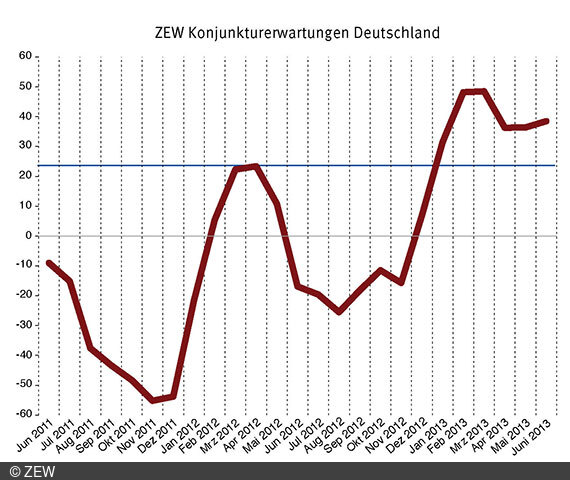 Die ZEW-Konjunkturerwartungen für Deutschland haben sich im Juni 2013 leicht verbessert. Mit 38,5 Punkten steht der Indikator 2,1 Punkte besser als im Mai 2013.