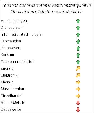 Bezüglich der erwarteten Entwicklung der Investitionstätigkeiten in Schlüsselbranchen zeigt sich bei elf von 14 Wirtschaftszweigen ein im Vergleich zum zweiten Quartal 2014 unverändertes Stimmungsbild. Bei Einzelhandel, Energie und Maschinenbau haben sich die Erwartungen leicht eingetrübt. Die stärksten Steigerungen werden für Versicherungen und Dienstleister erwartet, wohingegen in der Stahl- und Metallindustrie sowie im Bausektor weiter von einem spürbaren Abbau vorhandener Überkapazitäten ausgegangen wird.