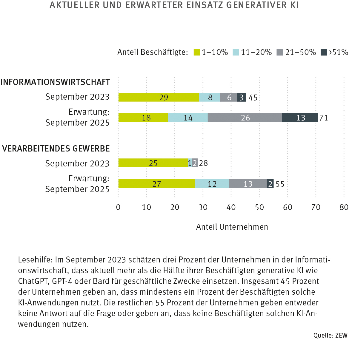 „In rund 45 Prozent der Unternehmen in der Informationswirtschaft nutzt aktuell zumindest ein Teil der Beschäftigten KI-Sprachmodelle für die Arbeit. Im Verarbeitenden Gewerbe sind es 28 Prozent. In zahlreichen Unternehmen etabliert sich ChatGPT und Co. also derzeit im Arbeitsalltag. Für die kommenden zwei Jahre rechnen die Unternehmen außerdem mit einem starken Anstieg der Nutzung generativer KI“, kommentiert Dr. Daniel Erdsiek, Wissenschaftler im ZEW-Forschungsbereich „Digitale Ökonomie“, die Ergebnisse.