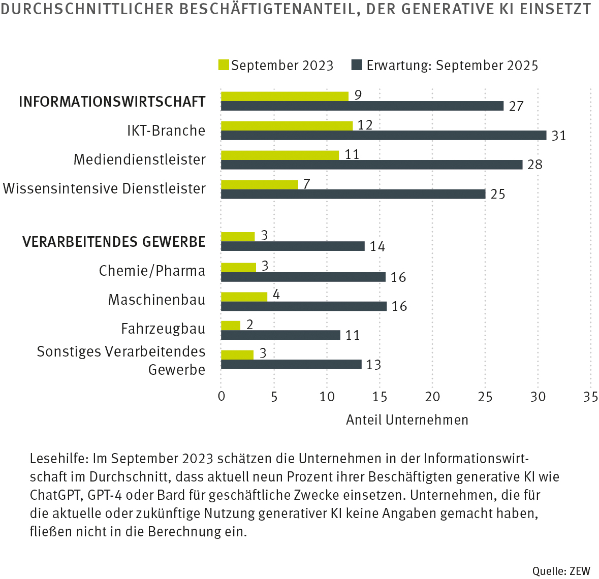 „Im Durchschnitt schätzen die Unternehmen in der Informationswirtschaft, dass momentan neun Prozent ihrer Beschäftigten generative KI in Form von Sprachmodellen für die Arbeit einsetzen“, erklärt Erdsiek. „Für die kommenden zwei Jahre gehen die Unternehmen von einer Verdreifachung der Verbreitung aus – auf einen durchschnittlichen Beschäftigtenanteil von 27 Prozent.“