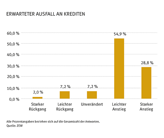 Bezogen auf die Anzahl der ausfallenden Kredite erwarten 55 Prozent der Befragten einen leichten Anstieg und 29 Prozent einen starken Anstieg. Beim ausfallenden Kreditvolumen gehen 62 Prozent von einem leichten und 17 Prozent von einem starken Anstieg aus.