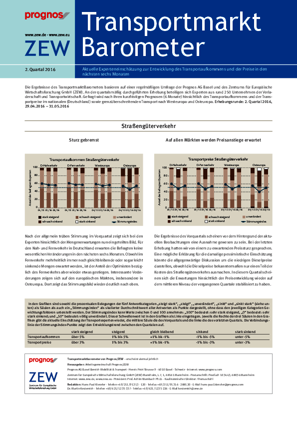 Zu diesem Ergebnis kommt das TransportmarktBarometer von Prognos/ZEW im zweiten Quartal 2016. Für die Erhebung befragen die Prognos AG, Basel, und das Zentrum für Europäische Wirtschaftsforschung (ZEW), Mannheim, vierteljährlich rund 250 Spitzenkräfte aus der Transportwirtschaft und der verladenden Wirtschaft dazu, wie sie die Entwicklung der Transportmengen und der Transportpreise auf Sicht des kommenden halben Jahres einschätzen.