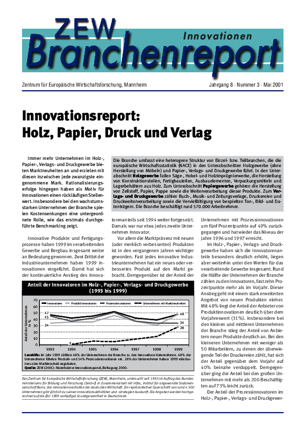 Immer mehr Unternehmen im Holz-, Papier-, Verlags- und Druckgewerbe bieten Marktneuheiten an und erzielen mit diesen inzwischen jede zwanzigste eingenommene Mark. Rationalisierungserfolge hingegen haben als Motiv für Innovationen einen rückläufigen Stellenwert. Insbesondere bei den wachstumsstarken Unternehmen der Branche spielen Kostensenkungen eine untergeordnete Rolle, wie das erstmals durchgeführte Benchmarking zeigt.