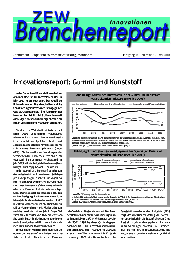 In der Gummi und Kunststoff verarbeitenden Industrie ist der Anteil der Innovatoren zurückgegangen. Der Anteil der Unternehmen mit Marktneuheiten liegt nach wie vor über dem im verarbeitenden Gewerbe insgesamt. Kosten reduzierende Prozessinnovationen haben deutlich an Bedeutung verloren. Die wachstumsstärksten Betriebe wendeten mehr für Innovationen auf als die Branche im Durchschnitt.