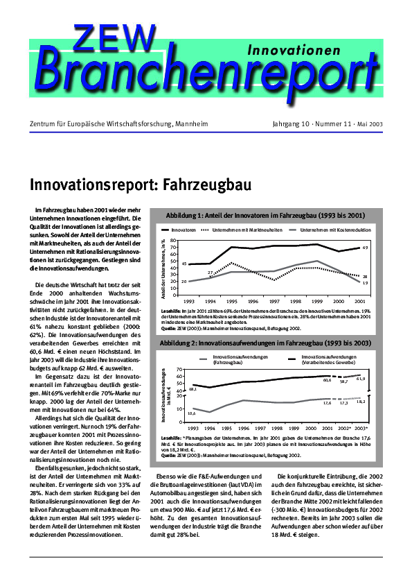 Im Fahrzeugbau haben 2001 wieder mehr Unternehmen Innovationen eingeführt. Die Qualität der Innovationen ist allerdings gesunken. Sowohl der Anteil der Unternehmen mit Marktneuheiten, als auch der Anteil der Unternehmen mit Rationalisierungsinnovationen ist zurückgegangen. Gestiegen sind die Innovationsaufwendungen.