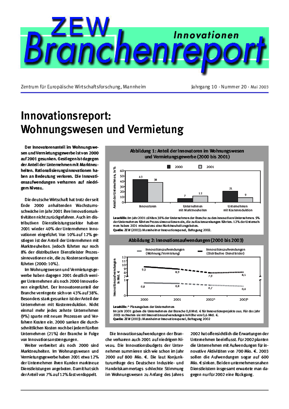 Der Innovatorenanteil im Wohnungswesen und Vermietungsgewerbe ist von 2000 auf 2001 gesunken. Gestiegen ist dagegen der Anteil der Unternehmen mit Marktneuheiten. Rationalisierungsinnovationen haben an Bedeutung verloren. Die Innovationsaufwendungen verharren auf niedrigem Niveau.