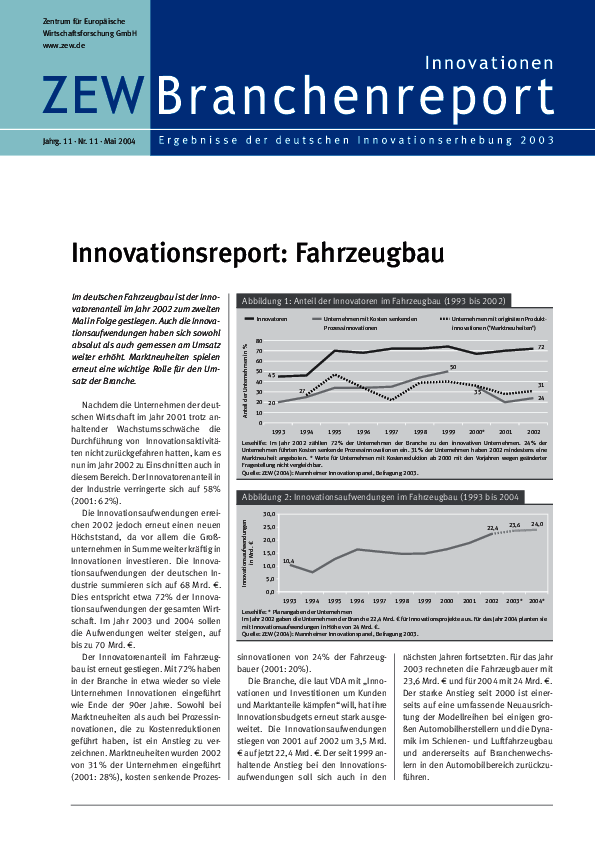Im deutschen Fahrzeugbau ist der Innovatorenanteil im Jahr 2002 zum zweiten Mal in Folge gestiegen. Auch die Innovationsaufwendungen haben sich sowohl absolut als auch gemessen am Umsatz weiter erhöht. Marktneuheiten spielen erneut eine wichtige Rolle für den Umsatz der Branche.