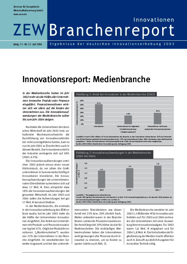 In der Medienbranche haben im Jahr 2002 mehr als die Hälfte aller Unternehmen innovative Produkt oder Prozesse eingeführt. Prozessinnovationen wirkten sich vor allem auf die Kosten der Unternehmen aus. Die Innovationsaufwendungen der Medienbranche sollen bis zum Jahr 2004 steigen.