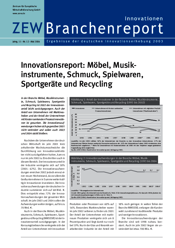 In der Branche Möbel, Musikinstrumente, Schmuck, Spielwaren, Sportgeräte und Recycling ist 2002 der Innovatorenanteil leicht zurückgegangen. Auch der Anteil von Unternehmen mit Marktneuheiten und der Anteil der Unternehmen mit Kosten senkenden Prozessinnovationen ist gesunken. Die Innovationsaufwendungen haben sich gegenüber 2001 nicht verändert und sollen auch 2003 und 2004 stabil bleiben.