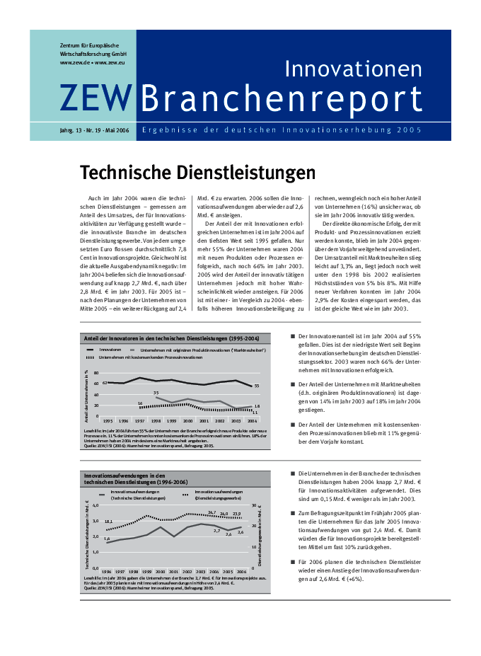 Auch im Jahr 2004 waren die technischen Dienstleistungen – gemessen am Anteil des Umsatzes, der für Innovationsaktivitäten zur Verfügung gestellt wurde – die innovativste Branche im deutschen Dienstleistungsgewerbe. Von jedem umgesetzten Euro flossen durchschnittlich 7,8 Cent in Innovationsprojekte. Gleichwohl ist die aktuelle Ausgabendynamik negativ: Im Jahr 2004 beliefen sich die Innovationsaufwendung auf knapp 2,7 Mrd. €, nach über 2,8 Mrd. € im Jahr 2003. Für 2005 ist – nach den Planungen der Unternehmen von Mitte 2005 – ein weiterer Rückgang auf 2,4 Mrd. € zu erwarten. 2006 sollen die Innovationsaufwendungen aber wieder auf 2,6 Mrd. € ansteigen. Der Anteil der mit Innovationen erfolgreichen Unternehmen ist im Jahr 2004 auf den tiefsten Wert seit 1995 gefallen. Nur mehr 55% der Unternehmen waren 2004 mit neuen Produkten oder Prozessen erfolgreich, nach noch 66% im Jahr 2003. 2005 wird der Anteil der innovativ tätigen Unternehmen jedoch mit hoher Wahrscheinlichkeit wieder ansteigen. Für 2006 ist mit einer - im Vergleich zu 2004 - ebenfalls höheren Innovationsbeteiligung zu rechnen, wenngleich noch ein hoher Anteil von Unternehmen (16%) unsicher war, ob sie im Jahr 2006 innovativ tätig werden. Der direkte ökonomische Erfolg, der mit Produkt- und Prozessinnovationen erzielt werden konnte, blieb im Jahr 2004 gegenüber dem Vorjahr weitgehend unverändert. Der Umsatzanteil mit Marktneuheiten stieg leicht auf 3,3% an, liegt jedoch noch weit unter den 1998 bis 2002 realisierten Höchstständen von 5% bis 8%. Mit Hilfe neuer Verfahren konnten im Jahr 2004 2,9% der Kosten eingespart werden, das ist der gleiche Wert wie im Jahr 2003.