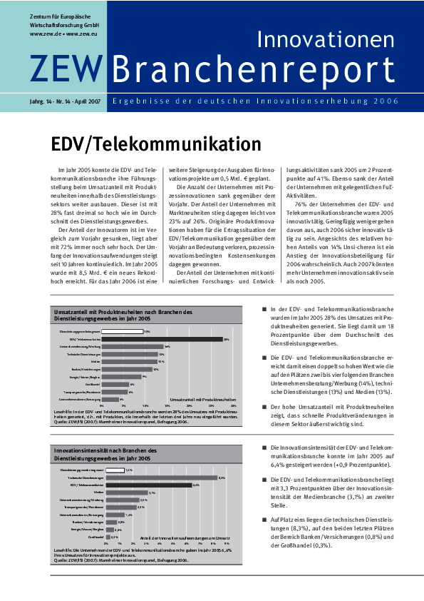 Im Jahr 2005 konnte die EDV- und Telekommunikationsbranche ihre Führungsstellung beim Umsatzanteil mit Produktneuheiten innerhalb des Dienstleistungssektors weiter ausbauen. Dieser ist mit 28% fast dreimal so hoch wie im Durchschnitt des Dienstleistungsgewerbes. Der Anteil der Innovatoren ist im Vergleich zum Vorjahr gesunken, liegt aber mit 72% immer noch sehr hoch. Der Umfang der Innovationsaufwendungen steigt seit 10 Jahren kontinuierlich. Im Jahr 2005 wurde mit 8,5 Mrd. € ein neues Rekordhoch erreicht. Für das Jahr 2006 ist eine weitere Steigerung der Ausgaben für Innovationsprojekte um 0,5 Mrd. € geplant. Die Anzahl der Unternehmen mit Prozessinnovationen sank gegenüber dem Vorjahr. Der Anteil der Unternehmen mit Marktneuheiten stieg dagegen leicht von 23% auf 26%. Originäre Produktinnovationen haben für die Ertragssituation der EDV/Telekommunikation gegenüber dem Vorjahr an Bedeutung verloren, prozessinnovationsbedingten Kostensenkungen dagegen gewonnen. Der Anteil der Unternehmen mit kontinuierlichen Forschungs- und Entwicklungsaktivitäten sank 2005 um 2 Prozentpunkte auf 41%. Ebenso sank der Anteil der Unternehmen mit gelegentlichen FuE-Aktivitäten. 76% der Unternehmen der EDV- und Telekommunikationsbranche waren 2005 innovativ tätig. Geringfügig weniger gehen davon aus, auch 2006 sicher innovativ tätig zu sein. Angesichts des relativen hohen Anteils von 14% Unsicheren ist ein Anstieg der Innovationsbeteiligung für 2006 wahrscheinlich. Auch 2007 könnte  nmehr Unternehmen innovationsaktiv sein als noch 2005.