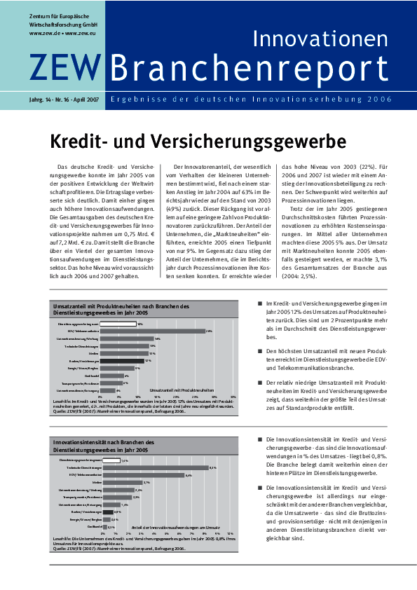 Das deutsche Kredit- und Versicherungsgewerbe konnte im Jahr 2005 von der positiven Entwicklung der Weltwirtschaft profitieren. Die Ertragslage verbesserte sich deutlich. Damit einher gingen auch höhere Innovationsaufwendungen. Die Gesamtausgaben des deutschen Kredit- und Versicherungsgewerbes für Innovationsprojekte nahmen um 0,75 Mrd. € auf 7,2 Mrd. € zu. Damit stellt die Branche über ein Viertel der gesamten Innovationsaufwendungen im Dienstleistungssektor. Das hohe Niveau wird voraussichtlich auch 2006 und 2007 gehalten. Der Innovatorenanteil, der wesentlich vom Verhalten der kleineren Unternehmen bestimmt wird, fiel nach einem starken Anstieg im Jahr 2004 auf 63 % im Berichtsjahr wieder auf den Stand von 2003 (49%) zurück. Dieser Rückgang ist vor allem auf eine geringere Zahl von Produktinnovatoren zurückzuführen. Der Anteil der Unternehmen, die „Marktneuheiten“ einführten, erreichte 2005 einen Tiefpunktvon nur 9%. Im Gegensatz dazu stieg der Anteil der Unternehmen, die im Berichtsjahr durch Prozessinnovationen ihre Kosten senken konnten. Er erreichte wieder das hohe Niveau von 2003 (22%). Für 2006 und 2007 ist wieder mit einem Anstieg der Innovationsbeteiligung zu rechnen. Der Schwerpunkt wird weiterhin auf Prozessinnovationen liegen. Trotz der im Jahr 2005 gestiegenen Durchschnittskosten führten Prozessinnovationen zu erhöhten Kostenseinsparungen. Im Mittel aller Unternehmen machten diese 2005 5% aus. Der Umsatz mit Marktneuheiten konnte 2005 ebenfalls gesteigert werden, er machte 3,1% des Gesamtumsatzes der Branche aus (2004: 2,5%).