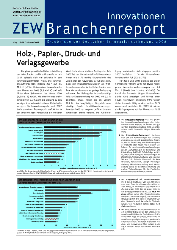 Die günstige wirtschaftliche Entwicklung der Holz-, Papier- und Druckindustrie im Jahr 2007 spiegelt sich nur teilweise in den Innovationsaktivitäten wider. Die Innovationsaufwendungen stiegen 2007 auf 2,6 Mrd. € (+7%), bleiben aber dennoch unter dem Niveau von 2005 (2,8 Mrd. €) und weit hinter dem Spitzenwert des Jahres 2000 (3,6 Mrd. €) zurück. Mit einer Innovationsintensität von 2,5% zählt die Branche zu den weniger innovationsintensiven Wirtschaftszweigen. Die Innovatorenquote sank 2007 leicht um einen Prozentpunkt auf 50% - in der längerfristigen Perspektive ein mittlerer Wert. Trotz eines leichten Anstiegs im Jahr 2007 ist der Umsatzanteil mit Produktneuheiten mit 11% niedrig (Durchschnitt des verarbeitenden Gewerbes: 27%) und zeigt, dass den Innovationsaktivitäten als Wettbewerbsparameter in der Holz-, Papier- und Druckindustrie eine eher geringe Bedeutung zukommt. Der Beitrag der Innovationstätigkeit zur Kostensenkung war 2007 mit 3,0% ebenfalls etwas höher als im Vorjahr (2,4%), im langfristigen Vergleich aber niedrig. Durch Qualitätsverbesserungen konnten 2007 nur magere 1,6% an Umsatzzuwächsen erzielt werden. Die FuE-Beteiligung entwickelte sich dagegen positiv, 2007 betrieben 11% der Unternehmen kontinuierlich FuE (2006: 7%). Für 2008 und 2009 planten die Unternehmen im Frühjahr 2008 mit etwas niedrigeren Innovationsaufwendungen von 2,4 Mrd. € (2008) bzw. 2,3 Mrd. € (2009). Der Anteil der innovativ tätigen Unternehmen dürfte 2008 ansteigen und könnte einen neuen Höchstwert erreichen: 50% wollen sicher innovativ tätig werden, weitere 17% waren noch unsicher. Für 2009 ist wieder ein Rückgang etwa auf das Niveau von 2007 zu erwarten.