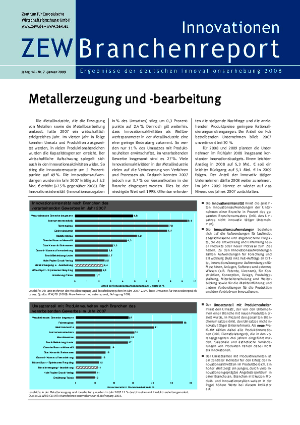 Die Metallindustrie, die die Erzeugung von Metallen sowie die Metallbearbeitung umfasst, hatte 2007 ein wirtschaftlich erfolgreiches Jahr. Im vierten Jahr in Folge konnten Umsatz und Produktion ausgeweitet werden, in vielen Produktionsbereichen wurden die Kapazitätsgrenzen erreicht. Der wirtschaftliche Aufschwung spiegelt sich auch in den Innovationsaktivitäten wider. So stieg die Innovatorenquote um 5 Prozentpunkte auf 49%. Die Innovationsaufwendungen wurden im Jahr 2007 kräftig auf 5,2 Mrd. € erhöht (+25% gegenüber 2006). Die Innovationsintensität (Innovationsausgaben in % des Umsatzes) stieg um 0,3 Prozentpunkte auf 2,4%. Dennoch gilt weiterhin, dass Innovationsaktivitäten als Wettbewerbsparameter in der Metallindustrie eine eher geringe Bedeutung zukommt. So werden nur 11% des Umsatzes mit Produktneuheiten erwirtschaftet, im verarbeitenden Gewerbe insgesamt sind es 27%. Viele Innovationsaktivitäten in der Metallindustrie zielen auf die Verbesserung von Verfahren und Prozessen ab. Dadurch konnten 2007 jedoch nur 3,7% der Gesamtkosten in der Branche eingespart werden. Dies ist der niedrigste Wert seit 1998. Offenbar erforderten die steigende Nachfrage und die anziehenden Produktpreise geringere Rationalisierungsanstrengungen. Der Anteil der FuE betreibenden Unternehmen blieb 2007 unverändert bei 30%. Für 2008 und 2009 planten die Unternehmen im Frühjahr 2008 insgesamt konstanten Innovationsbudgets. Einem leichten Anstieg in 2008 auf 5,3 Mrd. € soll ein leichter Rückgang auf 5,1 Mrd. € in 2009 folgen. Der Anteil der innovativ tätigen Unternehmen dürfte 2008 weiter zunehmen, im Jahr 2009 könnte er wieder auf das Niveau des Jahres 2007 zurückfallen.