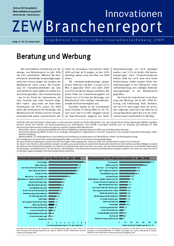 Die wirtschaftliche Entwicklung der Beratungs- und Werbebranche im Jahr 2008 war eher uneinheitlich. Während die Beraterbranche zweistellige Umsatzsteigerungen verbuchen konnte, gingen die Umsätze der Werbebranche leicht zurück. Die Entwicklung der Innovationsaktivitäten war dem uneinheitlichen wirtschaftlichen Umfeld entsprechend gespalten. Die Innovatorenquote - das ist der Anteil der Unternehmen, die neue Produkte oder neue Prozesse eingeführt haben - ging leicht um etwa einen Prozentpunkt auf 39% zurück. Für 2009 waren die Unternehmen der Beratungs- und Werbebranche im Hinblick auf ihre Innovationsbereitschaft wieder zuversichtlicher. Der Anteil der innovativen Unternehmen dürfte 2009 auf über 40% steigen, im Jahr 2010 allerdings wieder unter den Wert von 2008 sinken. Die Innovationsaufwendungen gingen im Jahr 2008 auf 1,86 Mrd. € zurück (-0,15 Mrd. € gegenüber 2007) und sollen 2009 und 2010 auf diesem Niveau verbleiben. Mit einem Anteil der Innovationsausgaben am Umsatz von 1,3% weist die Beratungs- und Werbebranche eine niedrige Innovationsintensität im Branchenvergleich auf. Ebenfalls niedrig ist der Umsatzanteil neuer Produkte. Er betrug 2008 nur 10,7%, nach noch 18,0% in 2007. Dagegen konnte der Branchenumsatz aufgrund von Qualitätsverbesserungen um 3,0% gesteigert werden, nach 2,2% im Vorjahr. Die Kosteneinsparungen durch Prozessinnovationen blieben 2008 mit 2,6% unter dem hohen Vorjahrsniveau. Dabei standen höher Kosteneinsparungen in der Teilbranche Unternehmensberatung sehr niedrigen Rationalisierungserfolgen in der Werbebranche gegenüber. Der Anteil der Unternehmen in der Beratung und Werbung, die im Jahr 2008 Forschung und Entwicklung (FuE) betrieben, war mit 10% zwar etwas höher als im Vorjahr, zeigt aber, dass FuE in der Branche nur eine geringe Rolle spielt. Nur 4% der Unternehmen waren kontinuierlich in FuE tätig.