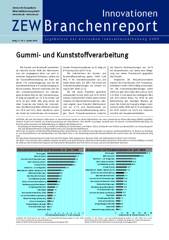 Die Gummi und Kunststoff verarbeitende Industrie konnte 2008 den Wachstumskurs der vergangenen Jahre nur noch in einzelnen Segmenten fortsetzen, sodass bei der Kunststoffverarbeitung am Ende des Jahres 2% Umsatzsteigerung und bei der Gummiverarbeitung 4% Umsatzrückgang zu Buche standen. Dennoch zeichnete sich bei den Innovationsindikatoren ein überwiegend positives Bild ab. Die Innovatorenquote stieg sprunghaft von 51% im Vorjahr auf 63% im Jahr 2008. Dies ging einher mit einer Zunahme des Anteils der Unternehmen, die Marktneuheiten einführen konnten von 20% auf 26%. Noch deutlicher nahm der Anteil der Unternehmen mit kostensenkenden Prozessinnovationen zu: Er stieg um 8 Prozentpunkte auf 25% an. Die Unternehmen der Gummi- und Kunststoffverarbeitung gaben 2008 1,98 Mrd. € für Innovationsprojekte aus und damit etwas mehr als 2007. Der Anteil der Innovationsaufwendungen am Umsatz betrug im Jahr 2008 2,5%. Der mit neuen Produkten generierte Umsatzanteil konnte leicht auf 14% erhöht werden. Verantwortlich hierfür waren höhere Umsätze mit Nachahmerinnovationen, während originär neue Produkte (Marktneuheiten) nur 3,7% zum Gesamtumsatz der Gummi- und Kunststoffverarbeitung beitrugen. Durch Prozessinnovationen erreichte die Branche Kostensenkungen von 3,6% der Gesamtkosten und damit eine Steigerung von einem Prozentpunkt gegenüber dem Vorjahr. Angesichts der Konjunkturschwäche planten die Unternehmen, ihre Innovationsaktivitäten im Jahr 2009 kräftig zurückzufahren. Die Innovationsaufwendungen sollen 2009 um über eine halbe Mrd. auf nur mehr 1,41 Mrd. € und damit den niedrigsten Wert seit zehn Jahren fallen. Für 2010 ist eine Beibehaltung des niedrigen Niveaus geplant. Der Anteil der innovativ tätigen Unternehmen dürfte 2009 auf 55% zurückgehen. Für 2010 planten nur 51% der Unternehmen fest mit Innovationsaktivitäten.