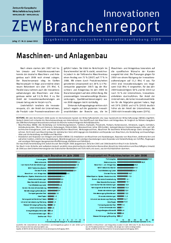Nach einem starken Jahr 2007 mit hohen Umsatz- und Produktionszuwächsen konnte der deutsche Maschinen- und Anlagenbau auch 2008 noch einmal zulegen. Der Branchenumsatz stieg im fünften Wachstumsjahr in Folge und erreichte einen neuen Rekordwert von über 275 Mrd. €. Parallel dazu nahmen auch die Innovationsaufwendungen des Maschinen- und Anlagenbaus weiter auf 12,76 Mrd. € zu. Der Anteil der Innovationsaufwendungen am Umsatz betrug wie im Vorjahr 4,6%. Uneinheitlich tendierte die Innovatorenquote, d.h. der Anteil der Unternehmen, die Produkt- oder Prozessinnovationen eingeführt haben. Sie blieb im Berichtsjahr im Branchenmittel bei 68% stabil, verzeichnete jedoch in der Teilbranche Maschinenbau einen Anstieg von 75% (2007) auf 77% in 2008. Mit einem durch Produktneuheiten generierten Umsatzanteil von 28% (+3 Prozentpunkte gegenüber 2007) lag der Maschinen- und Anlagenbau im Jahr 2008 im Branchenvergleich auf dem dritten Rang. Die prozessseitigen Innovationserfolge (Kostensenkungen, Qualitätsverbesserungen) waren 2008 dagegen leicht rückläufig. Sinkende Auftragseingänge wirkten sich jedoch negativ auf die geplanten Innovationsaktivitäten der Branche aus, die im Maschinen- und Anlagenbau besonders auf die spezifischen Wünsche der Kunden ausgerichtet sind. Die Planungen gingen für 2009 von einem Rückgang der Innovationsaufwendungen auf 11,1 Mrd. € aus. Für 2010 sind Innovationsbudgets von insgesamt 10,8 Mrd. € vorgesehen. Für das Jahr 2009 beabsichtigten 58% und für 2010 nur noch 55% der Unternehmen, Innovationsaktivitäten durchzuführen. Der Anteil der Unternehmen, die keine Innovationsaktivitäten für die Folgejahre geplant haben, liegt mit 39% (2009) und 42% (2010) deutlich höher als der Anteil der Unternehmen, die 2008 nicht innovativ tätig waren (29%).