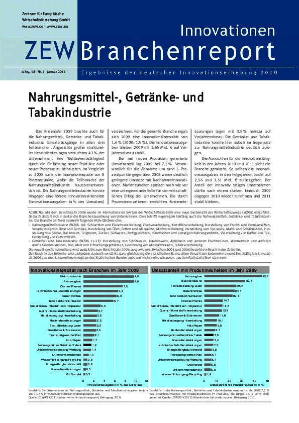 Das Krisenjahr 2009 brachte auch für die Nahrungsmittel-, Getränke- und Tabakindustrie Umsatzrückgänge in allen drei Teilbranchen. Angesichts großer struktureller Herausforderungen versuchten 43% der Unternehmen, ihre Wettbewerbsfähigkeit durch die Einführung neuer Produkte oder neuer Prozesse zu behaupten. Im Vergleich zu 2008 sank die Innovatorenquote um 8 Prozentpunkte, wofür die Teilbranche der Nahrungsmittelindustrie hauptverantwortlich ist. Die Nahrungsmittelindustrie konnte hingegen eine höhere Innovationsintensität (Innovationsausgaben in % des Umsatzes) verzeichnen. Für die gesamte Branche ergab sich 2009 eine Innovationsintensität von 1,6% (2008: 1,5%). Die Innovationsausgaben blieben 2009 mit 2,65 Mrd. € auf Vorjahresniveau stabil. Der mit neuen Produkten generierte Umsatzanteil lag 2009 bei 7,5%. Verantwortlich für die Abnahme um rund 5 Prozentpunkte gegenüber 2008 waren deutlich geringere Umsätze mit Nachahmerinnovationen. Marktneuheiten spielten nach wie vor eine untergeordnete Rolle für den wirtschaftlichen Erfolg der Unternehmen. Die durch Prozessinnovationen erreichten Kosteneinsparungen lagen mit 3,8% nahezu auf Vorjahresniveau. Die Getränke- und Tabakindustrie konnte hier jedoch im Gegensatz zur Nahrungsmittelindustrie deutlich zulegen. Die Aussichten für die Innovationstätigkeit in den Jahren 2010 und 2011 sieht die Branche gemischt. So sollten die Innovationsausgaben in den Folgejahren leicht auf 2,56 und 2,51 Mrd. € zurückgehen. Der Anteil der innovativ tätigen Unternehmen dürfte nach einem starken Einbruch 2009 dagegen 2010 wieder zunehmen und 2011 stabil bleiben.
