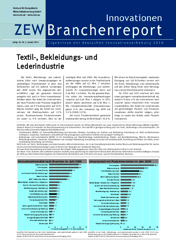 Die Textil-, Bekleidungs- und Lederindustrie blickt nach Umsatzrückgängen im zweistelligen Prozentbereich in allen drei Teilbranchen auf ein äußerst schwieriges Jahr 2009 zurück. Die angespannte wirtschaftliche Lage der gesamten Branche spiegelte sich auch in ihren Innovationsaktivitäten wider. Der Anteil der Unternehmen, die neue Produkte oder Prozesse eingeführt haben, sank um 8 Prozentpunkte auf 50%. Ebenso deutlich ging der Anteil der Unternehmen mit Marktneuheiten auf 22% zurück. Kostensenkende Prozessinnovatoren waren zu 9% vertreten. Dies ist der niedrigste Wert seit 2000. Die Innovationsaufwendungen wurden in der Textilindustrie um die Hälfte auf 0,2 Mrd. € reduziert, wohingegen die Bekleidungs- und Lederindustrie ihr Innovationsbudget leicht auf 0,36 Mrd. € erhöhte. Für die gesamte Branche sollen die Innovationsaufwendungen zunächst auf 0,65 Mrd. € steigen, in 2011 jedoch wieder abnehmen auf 0,58 Mrd. €. Die Innovationsintensität (Innovationsausgaben in % des Umsatzes) lag 2009 bei 2,5% (2008: 2,9%). Der durch Produktneuheiten generierte Umsatzanteil betrug im Berichtsjahr 25,4%. Mit einem im Branchenvergleich moderaten Rückgang von 0,8%-Punkten konnte sich die Textil-, Bekleidungs- und Lederindustrie auf den dritten Rang hinter dem Fahrzeugbau und der Elektroindustrie verbessern. Für 2010 und 2011 zeichnet sich eine etwas geringere Innovationsbereitschaft ab, wobei 4% bzw. 6% der Unternehmen noch unsicher waren hinsichtlich ihrer Innovationsaktivitäten. Der Anteil der Unternehmen mit gleichzeitigen Produkt- und Prozessinnovationen dürfte deutlich steigen, allerdings zu Lasten des Anteils reiner Produktinnovatoren.