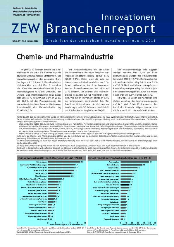 Im Jahr 2010 konnten sowohl die Chemieindustrie als auch die Pharmaindustrie deutliche Umsatzanstiege verzeichnen. Die Innovationsausgaben der gesamten Branche lagen mit 12,9 Mrd. € über dem bisher höchsten Wert von 12,6 Mrd. € aus dem Jahr 2008. Die Innovationsintensität (Inno-vationsausgaben in % des Umsatzes) der Chemie- und Pharmaindustrie sank dabei aber von 7,1% in 2009 auf 6,3% in 2010. Mit 12,4% ist die Pharmaindustrie die innovationsintensivere Branche. Die Innovationsintensität der Chemieindustrie lag 2010 bei 4,0%. Die Innovatorenquote, d.h. der Anteil der Unternehmen, die neue Produkte oder Prozesse eingeführt haben, betrug 81% (2009: 83%). Dabei stieg die Zahl der Unternehmen mit Marktneuheiten um 3%-Punkte, während der Anteil der kostensenkenden Prozessinnovatoren von 25% auf 21% abnahm. Die Chemie- und Pharmaindustrie ist zudem auf FuE-Aktivitäten orientiert. Wie schon im Vorjahr betrieben 62% der Unternehmen kontinuierlich FuE. Der Anteil der Unternehmen, die sich nur anlassbezogen mit FuE befassen, sank leicht um 2%-Punkte im Vergleich zum Vorjahr. Die Innovationserfolge sind dagegen weniger markant. Nur 15,1% des Branchenumsatzes wurden mit Produktneuheiten erzielt (2008: 19,7%). Der Umsatzanteil mit Marktneuheiten stieg leicht von 3,1% auf 3,2%. Nach drei Jahren zurückgehender Kosteneinsparungen stieg im Berichtsjahr der Kostensenkungsanteil durch Prozessinnovationen um 0,3%-Punkte auf 3,6%. Für 2011/12 lassen die Planzahlen eine stetige Zunahme der Innovationsausgaben auf 14,1 Mrd. € bis 2012 erwarten. Der Anteil der innovativ tätigen Unternehmen dürfte sowohl 2011 als auch 2012 sinken.