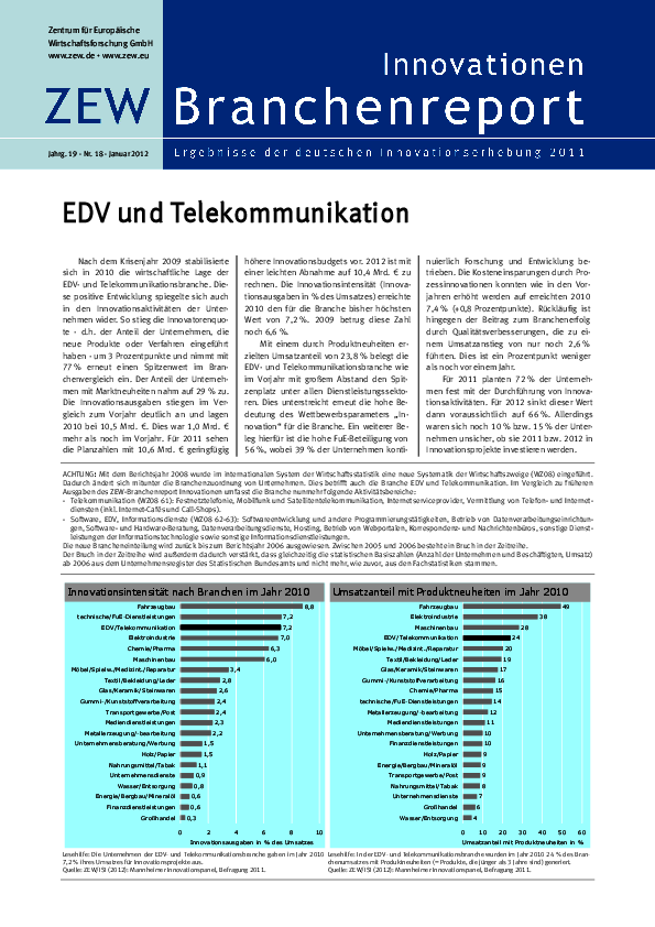 Nach dem Krisenjahr 2009 stabilisierte sich in 2010 die wirtschaftliche Lage der EDV- und Telekommunikationsbranche. Diese positive Entwicklung spiegelte sich auch in den Innovationsaktivitäten der Unternehmen wider. So stieg die Innovatorenquote - d.h. der Anteil der Unternehmen, die neue Produkte oder Verfahren eingeführt haben - um 3 Prozentpunkte und nimmt mit 77% erneut einen Spitzenwert im Branchenvergleich ein. Der Anteil der Unternehmen mit Marktneuheiten nahm auf 29% zu. Die Innovationsausgaben stiegen im Vergleich zum Vorjahr deutlich an und lagen 2010 bei 10,5 Mrd. €. Dies war 1,0 Mrd. € mehr als noch im Vorjahr. Für 2011 sehen die Planzahlen mit 10,6 Mrd. € geringfügig höhere Innovationsbudgets vor. 2012 ist mit einer leichten Abnahme auf 10,4 Mrd. € zu rechnen. Die Innovationsintensität (Innovationsausgaben in % des Umsatzes) erreichte 2010 den für die Branche bisher höchsten Wert von 7,2%. 2009 betrug diese Zahl noch 6,6%. Mit einem durch Produktneuheiten erzielten Umsatzanteil von 23,8% belegt die EDV- und Telekommunikationsbranche wie im Vorjahr mit großem Abstand den Spitzenplatz unter allen Dienstleistungssektoren. Dies unterstreicht erneut die hohe Bedeutung des Wettbewerbsparameters „Innovation“ für die Branche. Ein weiterer Be-leg hierfür ist die hohe FuE-Beteiligung von 56%, wobei 39% der Unternehmen kontinuierlich Forschung und Entwicklung betrieben. Die Kosteneinsparungen durch Prozessinnovationen konnten wie in den Vorjahren erhöht werden auf erreichten 2010 7,4% (+0,8 Prozentpunkte). Rückläufig ist hingegen der Beitrag zum Branchenerfolg durch Qualitätsverbesserungen, die zu einem Umsatzanstieg von nur noch 2,6% führten. Dies ist ein Prozentpunkt weniger als noch vor einem Jahr. Für 2011 planten 72% der Unternehmen fest mit der Durchführung von Innovationsaktivitäten. Für 2012 sinkt dieser Wert dann voraussichtlich auf 66%. Allerdings waren sich noch 10% bzw. 15% der Unternehmen unsicher, ob sie 2011 bzw. 2012 in Innovationsprojekte investieren werden.