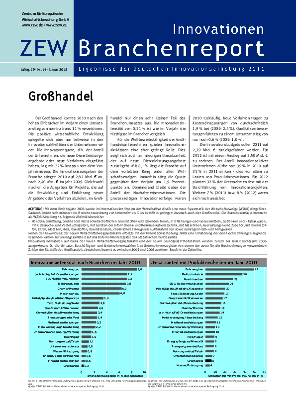 Der Großhandel konnte 2010 nach den hohen Einbrüchen im Vorjahr einen Umsatzanstieg von nominal rund 11% verzeichnen. Die positive wirtschaftliche Entwicklung spiegelte sich aber nur teilweise in den Innovationsaktivitäten der Unternehmen wider. Die Innovatorenquote, d.h. der Anteil der Unternehmen, die neue Dienstleistungsangebote oder neue Verfahren eingeführt haben, lag mit 32% knapp unter dem Vorjahresniveau. Die Innovationsausgaben der Branche stiegen 2010 auf 2,82 Mrd. € an, nach 2,40 Mrd. € im Jahr 2009. Gleichwohl machen die Ausgaben für Projekte, die auf die Entwicklung und Einführung neuer Angebote oder Verfahren abzielen, im Großhandel nur einen sehr kleinen Teil des Branchenumsatzes aus. Die Innovationsintensität von 0,31% ist wie im Vorjahr die niedrigste im Branchenvergleich. Für die Wettbewerbsfähigkeit der Großhandelsunternehmen spielen Innovationsaktivitäten eine eher geringe Rolle. Dies zeigt sich auch am niedrigen Umsatzanteil, der auf neue Dienstleistungsangebote zurückgeht. Mit 6,1% liegt die Branche auf dem vorletzten Rang unter allen Wirtschaftszweigen. Immerhin stieg die Quote gegenüber dem Vorjahr um 1,9 Prozentpunkte an. Dominierend bleibt dabei der Anteil der Nachahmerinnovationen. Die prozessseitigen Innovationserfolge waren 2010 rückläufig. Neue Verfahren trugen zu Kosteneinsparungen von durchschnittlich 1,9% bei (2009: 2,4%). Qualitätsverbesserungen führten zu einem Umsatzanstieg von nur noch 0,6% (2009: 1,8%). Die Innovationsbudgets sollen 2011 auf 2,39 Mrd. € zurückgefahren werden. Für 2012 ist mit einem Anstieg auf 2,58 Mrd. € zu rechnen. Der Anteil innovationsaktiver Unternehmen dürfte von 39% in 2010 auf 31% in 2011 sinken - dies vor allem zu Lasten von Produktinnovationen. Für 2012 planten 32% der Unternehmen fest mit der Durchführung von Innovationsprojekten. Weitere 7% (2011) bzw. 8% (2012) waren sich noch unsicher.