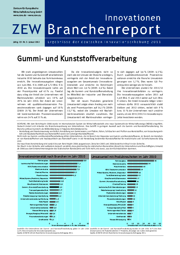 Mit stark angestiegenen Umsatzzahlen hat die Gummi und Kunststoff verarbeitende Industrie 2010 beinahe das Vorkrisenniveau erreicht. Die Innovationsausgaben stiegen von 1,64 Mrd. € in 2009 auf 1,72 Mrd. € in 2010 an. Die Innovatorenquote nahm um vier Prozentpunkte auf 61% zu. Parallel dazu stieg der Anteil der Unternehmen mit Marktneuheiten erheblich von 19% auf 29% im Jahr 2010. Der Anteil der Unternehmen mit qualitätsverbessernden Prozessinnovationen sank dagegen auf 18% (2009: 21%). Der Anteil der Unternehmen mit kostensenkenden Prozessinnovationen nahm von 24% auf 21% ab. Da die Innovationsbudgets nicht so stark wie der Umsatz der Branche anstiegen, verringerte sich der Anteil der Innovationsausgaben am Gesamtumsatz (Innovationsintensität) und erreichte im Berichtsjahr einen Wert von 2,4% (2009: 2,6%). Dabei lag die Gummi- und Kunststoffverarbeitung im Mittelfeld der Industrie- und Dienstleistungsbranchen. Der mit neuen Produkten generierte Umsatzanteil zeigte einen Anstieg von mehr als zwei Prozentpunkten auf 16,1% (2009: 13,7%), wobei die Umsätze mit Nachahmerinnovationen deutlich zunahmen. Der Umsatzanteil mit Marktneuheiten verringerte sich dagegen auf 3,6% (2009: 4,5%). Durch qualitätsverbessernde Prozessinnovationen erreichte die Branche Umsatzsteigerungen von 1,7%. Dies waren 0,8 Prozentpunkte weniger als im Vorjahr. Die Unternehmen planten für 2011/12 ihre Innovationsaktivitäten zu verringern. Die Innovationsausgaben sollen 2011 auf 1,69 Mrd. € und 2012 weiter auf 1,61 Mrd. € sinken. Der Anteil innovativ tätiger Unternehmen dürfte 2011 voraussichtlich stabil bleiben und 2012 sinken, wobei sich 9% bzw. 11% der Unternehmen noch unsicher waren, ob sie 2011/2012 in Innovationsprojekte investieren werden.