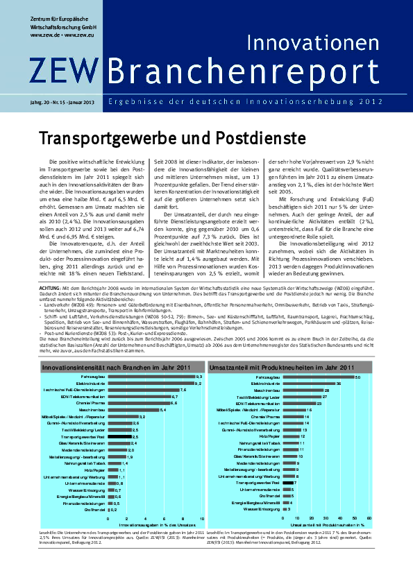 Die positive wirtschaftliche Entwicklung im Transportgewerbe sowie bei den Postdienstleistern im Jahr 2011 spiegelt sich auch in den Innovationsaktivitäten der Branche wider. Die Innovationsausgaben wurden um etwa eine halbe Mrd. € auf 6,5 Mrd. € erhöht. Gemessen am Umsatz machten sie einen Anteil von 2,5% aus und damit mehr als 2010 (2,4%). Die Innovationsausgaben sollen auch 2012 und 2013 weiter auf 6,74 Mrd. € und 6,95 Mrd. € steigen. Die Innovatorenquote, d.h. der Anteil der Unternehmen, die zumindest eine Produkt- oder Prozessinnovation eingeführt haben, ging 2011 allerdings zurück und erreichte mit 18% einen neuen Tiefststand. Seit 2008 ist dieser Indikator, der insbesondere die Innovationsfähigkeit der kleinen und mittleren Unternehmen misst, um 13 Prozentpunkte gefallen. Der Trend einer stärkeren Konzentration der Innovationstätigkeit auf die größeren Unternehmen setzt sich damit fort. Der Umsatzanteil, der durch neu eingeführte Dienstleistungsangebote erzielt werden konnte, ging gegenüber 2010 um 0,6 Prozentpunkte auf 7,3% zurück. Dies ist gleichwohl der zweithöchste Wert seit 2003. Der Umsatzanteil mit Marktneuheiten konnte leicht auf 1,4% ausgebaut werden. Mit Hilfe von Prozessinnovationen wurden Kosteneinsparungen von 2,5% erzielt, womit der sehr hohe Vorjahreswert von 2,9% nicht ganz erreicht wurde. Qualitätsverbesserungen führten im Jahr 2011 zu einem Umsatzanstieg von 2,1%, dies ist der höchste Wert seit 2005. Mit Forschung und Entwicklung (FuE) beschäftigten sich 2011 nur 5% der Unternehmen. Auch der geringe Anteil, der auf kontinuierliche Aktivitäten entfällt (2%), unterstreicht, dass FuE für die Branche eine untergeordnete Rolle spielt. Die Innovationsbeteiligung wird 2012 zunehmen, wobei sich die Aktivitäten in Richtung Prozessinnovationen verschieben. 2013 werden dagegen Produktinnovationen wieder an Bedeutung gewinnen.