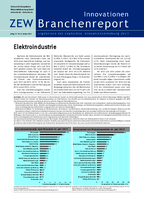 Nachdem die Elektroindustrie die Wirtschaftskrise rasch überwunden hatte und 2010 einen beachtlichen Auftrags- und Umsatzanstieg in allen Segmenten verzeichnet hat, konnte dieses Tempo 2011 und 2012 nicht gehalten werden. Der kurze Atem des wirtschaftlichen Aufschwungs ist auch in den Innovationsindikatoren abzulesen. Die Innovatorenquote (Anteil der Unternehmen mit Produkt- oder Prozessinnovationen) sank 2012 auf 69% (2011: 74%). Der Antteil FuE betreibender Unternehmen) ging auf 60% zurück (2011: 63%). Auch die Innovationsausgaben wurden 2012 zurückgenommen. In der Teilbranche Elektronik, Messtechnik und Optik wurden 9,3 Mrd. € (2011: 10,2 Mrd. €) für Innovationsprojekte bereitgestellt, die Elektrotechnik reduzierte ihr Innovationsbudget auf 6,7 Mrd. € (2011: 7,0 Mrd. €). Die Innovationsintensität (Anteil der Innovationsausgaben am Umsatz) war 2012 mit 8,7% weiterhin hoch. Damit nimmt die Elektroindustrie hinter dem Fahrzeugbau Rang 2 im Branchenvergleich ein. Auch beim Umsatzanteil mit Produktneuheiten musste die Elektroindustrie 2012 Rückgänge verbuchen. Der mit Marktneuheiten erzielte Anteil sank von 9,9% auf 5,3%. Auch der Rationalisierungsbeitrag von Prozessinnovationen (Verringerung der durchschnittlichen Stückkosten) fiel von 5,0 auf 4,2%. Beim Umsatzanstieg durch Qualitätsverbesserungen konnte die Branche eine leichte Verbesserung um 0,1 Punkte auf 3,4% erreichen. Für 2013 und 2014 planen die Unternehmen, ihre Innovationsausgaben auf 16,8 Mrd. € und 17,4 Mrd. € zu steigern. Der Anteil innovativ tätiger Unternehmen dürfte im Jahr 2013 zunehmen. Für 2014 sind die Unternehmen jedoch noch sehr vorsichtig. 15% der Unternehmen waren noch unsicher, ob sie in diesem Jahr Innovationsaktivitäten durchführen werden.