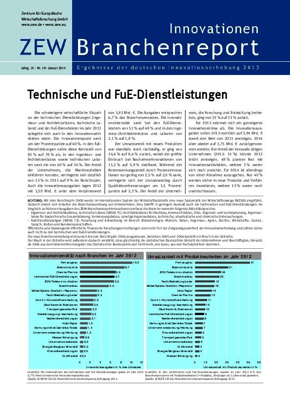 Die schwierigerewirtschaftliche Situati-onder technischen Dienstleistungen (Inge-nieur-und Architekturbüros, technische La-bore) und der FuE-Dienstleisterim Jahr 2012 spiegelte sich auch in den Innovationsakti-vitäten wider. Die Innovatorenquote sank um vier Prozentpunkte auf 40%. In den FuE-Dienstleistungen nahm diese Kennzahlvon 85% auf 78%ab, in denIngenieur-und Architektenbüros sowie technischen Labo-rensank sie von 40% auf 36%. Der Anteil der Unternehmen, die Marktneuheiten einführen konnten,verringerte sich deutlich von 13%in2011 auf 9%im Berichtsjahr. Auch die Innovationsausgaben lagen 2012 mit 3,59 Mrd. € unter dem Vorjahreswert von 3,93 Mrd. €. Die Ausgaben entsprachen 6,7% des Branchenumsatzes. Die Innovati-onsintensität sank beiden FuE-Dienst-leistern von 51% auf 48%und in den Inge-nieur-/Architektenbüros und Laboren von 2,1% auf 1,9%. Der Umsatzanteil mit neuen Produkten war ebenfalls stark rückläufig, er ging von 14,4% auf 8,4%zurück, wobei der größte Einbruch beiNachahmerinnovationen von 11,2% auf 5,9% stattfand. Während der Kostensenkungsanteil durch Prozessinnova-tionen nur gering von 2,5% auf 2,0% sank,verringerte sich der Umsatzanstieg durch Qualitätsverbesserungen um 1,5 Prozent-punkte auf 2,2%. Der Anteil der Unterneh-men, die Forschung und Entwicklung betrie-ben,gingvon 33% auf 31%zurück.Für 2013 zeichnet sich ein günstigeres Innovationsklima ab. Die Innovationsaus-gaben sollen 2013 merklich auf 3,94 Mrd. € damit den Wert von 2011 ansteigen.2014 aber wieder auf 3,75 Mrd. € zurückgenom-men werden.Der Anteil der innovativtätigen Unternehmen (2012: 51%) könnte2013 leicht ansteigen. 49% planten fest mit Innovationsaktivitäten, weitere 5% waren sich noch unsicher.Für 2014 ist allerdings von einer Abnahme auszugehen. Nur40% werden sicherin neue Produkte und Verfah-ren investieren, weitere 13% waren noch unentschlossen.