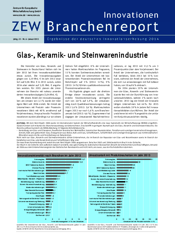 Die Hersteller von Glas-, Keramik- und Steinwaren in Deutschland hielten sich im Jahr 2013 bei ihren Innovationsaktivitäten etwas zurück. Die Innovationsausgaben gingen von 1,19 Mrd. € im Jahr 2012 deutlich auf 0,94 Mrd. € in 2013 zurück, sollen 2014 aber wieder auf 1,05 Mrd. € angehoben werden. Für 2015 planen die Unternehmen der Branche mit nahezu unveränderten Innovationsbudgets (1,04 Mrd. €). Mit einem Anteil der Innovationsausgaben am Umsatz von 2,1% wurde der niedrigste Wert seit 2006 erzielt. Der Anteil der Unternehmen mit Produkt- oder Prozessinnovationen blieb mit 40% annähernd auf Vorjahresniveau. Anspruchsvolle Produktinnovationen wurden allerdings nur von einem kleinen Teil eingeführt: 8% der Unternehmen hatten Marktneuheiten im Programm, 11% konnten Sortimentsneuheiten vorweisen. Der Anteil der Unternehmen mit kostensenkenden Prozessinnovationen fiel im Berichtsjahr auf 5% (2012: 12%), 9% (2012: 14%) führten qualitätsverbessernde Prozessinnovationen ein. Als Ergebnis gingen auch die direkten Erträge dieser Innovationen zurück. Die erzielte Stückkostensenkung verringerte sich von 2,8% auf 1,9%, der Umsatzanstieg durch Qualitätsverbesserungen betrug 2013 1,6% (2012: 2,6%). Marktneuheiten trugen 2013 nur noch 1,6% zum Branchenumsatz bei (2012: 4,6%). Zugenommen hat dagegen der Umsatzanteil Nachahmerinnovationen, er lag 2013 mit 11,1% um 3 Prozentpunkte über dem Vorjahreswert. Der Anteil der Unternehmen, die kontinuierlich FuE betrieben, blieb 2013 bei 15% kon-stant, während der Anteil der Unternehmen, die sich nur anlassbezogen mit FuE befasst haben, von 18 auf 6% einbrach. Für 2014 planten 39% der Unternehmen der Glas-, Keramik- und Steinwarenin-dustrie fest mit der Durchführung von Innovationsaktivitäten, weitere 2% waren noch unsicher. 2013 lag der Anteil der innovativ tätigen Unternehmen bei 44%. Für 2015 wollen ebenfalls 39% in jedem Fall Innovationsaktivitäten durchführen. Der Anteil der unsicheren ist mit 4% angesichts der unklaren Konjunkturaussichten niedrig.