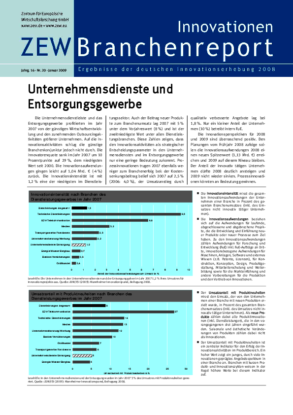 Die Branche der Unternehmensdienste erlebte nach dem schweren Jahr 2012 ein wirtschaftlich besseres Folgejahr 2013. Dies spiegelt sich auch in den Innovationsindikatoren wider. So nahm die Innovatorenquote in allen Teilbereichen der Branche zu. Am stärksten war der Anstieg bei den Personal- und Sicherheitsdiensten (von 28 auf 35%), gefolgt von den Grafik-, Büro-, Messe- und Produzentendiensten (von 33 auf 37%). In den Reinigungs- und Gebäudediensten stieg dieser Indikator um zwei Prozentpunkte auf 29%. Auch die Innovationsausgaben der Branche erhöhten sich von 0,71 auf 0,94 Mrd. €. 2014 wird sogar ein Anstieg auf 1,05 Mrd. € prognostiziert. 2015 sollen die Innovationsausgaben der Branche dann 0,95 Mrd. € betragen. Die Innovationsintensität lag bei 0,9% und damit deutlich über dem Wert aus 2012 (0,7%). Die Grafik-, Büro-, Messe-, Produzentendienste wiesen mit 1,5% die höchste Innovationsintensität auf, gefolgt von den Reinigungs- und Ge-bäudediensten (0,6%) und den Personal- und Sicherheitsdiensten (0,4%). Der Umsatzanteil von Produktneuheiten sank branchenweit von 4,8% in 2012 auf 3,5% in 2013. Dies ist auf den deutlichen Rückgang des Umsatzanteils mit Nachahmerinnovationen zurückzuführen. Dieser Wert sank um einen Prozentpunkt auf 2,8%. Der Umsatzanteil mit Marktneuheiten verringerte sich nur leicht von 1,0 auf 0,7%. Die Indikatoren zum Prozessinnovationserfolg entwickelten sich unterschiedlich: Während der Umsatzanstieg durch Qualitätsverbesserungen leicht sank (von 1,8 auf 1,5%), war der Kostensenkungsanteil mit 2,1% um 1,1 Prozentpunkte höher. 2014 planten 30% der Unternehmen fest mit Innovationsaktivitäten, weitere 6% waren noch unentschieden. Damit wird das Niveau von 2013 (38%) nicht erreicht werden. Für 2015 rechneten 28% fest mit der Umsetzung von Innovationen, weitere 7% waren sich noch unsicher. Prozessinnovationen werden zu Lasten von Produktinnovationen an Bedeutung gewinnen.