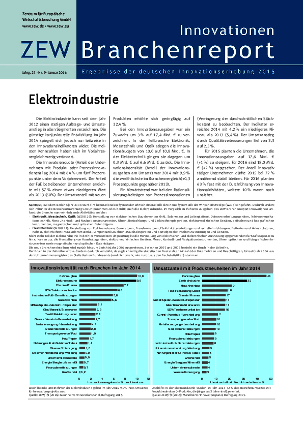 Die Elektroindustrie kann seit dem Jahr 2012 einen stetigen Auftrags- und Umsatzanstieg in allen Segmenten verzeichnen. Die günstige konjunkturelle Entwicklung im Jahr 2014 spiegelt sich jedoch nur teilweise in den Innovationsindikatoren wider. Die meisten Kennzahlen haben sich im Vorjahresvergleich kaum verändert. Die Innovatorenquote (Anteil der Unternehmen mit Produkt- oder Prozessinnovationen) lag 2014 mit 71 % einen Prozentpunkt über dem Vorjahreswert. Der Anteil der FuE betreibenden Unternehmen erreichte mit 57 % einen etwas niedrigeren Wert als 2013 (60%). Der Umsatzanteil mit neuen Produkten erhöhte sich geringfügig auf 32,4 %. Bei den Innovationsausgaben war ein Zuwachs um 3 % auf 17,3 Mrd. € zu verzeichnen. In der Teilbranche Elektronik, Messtechnik und Optik stiegen die Innovationsbudgets von 10,0 auf 10,8 Mrd. €. In der Elektrotechnik gingen sie dagegen um 0,3 Mrd. € auf 6,6 Mrd. € zurück. Die Innovationsintensität (Anteil der Innovationsausgaben am Umsatz) war 2014 mit 9,9 % die zweithöchste im Branchenvergleich(+0,3 Prozentpunkte gegenüber 2013). Ein Abwärtstrend war bei den Rationalisierungsbeiträgen von Prozessinnovationen (Verringerung der durchschnittlichen Stückkosten) zu beobachten. Der Indikator erreichte 2014 mit 4,2 % ein niedrigeres Niveau als 2013 (5,4 %). Der Umsatzanstieg durch Qualitätsverbesserungen fiel von 3,3 auf 2,5 %. Für 2015 planten die Unternehmen, die Innovationsausgaben auf 17,6 Mrd. € (+1 %) zu steigern. Für 2016 sind 18,0 Mrd. € (+2 %) vorgesehen. Der Anteil innovativ tätiger Unternehmen dürfte 2015 bei 72 % annähernd stabil bleiben. Für 2016 planten 63 % fest mit der Durchführung von Innovationsaktivitäten, weitere 10 % waren noch unsicher.