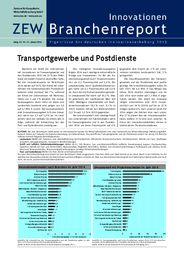 Nachdem der Anteil der Unternehmen mit Innovationen im Transportgewerbe und den Postdiensten 2013 mit 22 % den Tiefststand der beiden Vorjahre übertroffen hatte, fiel die Innovatorenquote im Berichtsjahr 2014 wieder auf 20 %. Der Anteil der Unternehmen mit kostensenkenden Prozessinnovationen blieb konstant bei 7 %, während der Anteil der Unternehmen mit Marktneuheiten von 3 auf 1 % abnahm. Die Innovationsausgaben, deren Höhe vor allem vom Landverkehr bestimmt wird, gingen von 5,9 auf 5,7 Mrd. € zurück. Die Innovationsintensität (Innovationsausgaben in % des Umsatzes) nahm von 2,2 auf 1,9 % ab. Im Landverkehr sank der Indikator im dritten Jahr in Folge, während die Entwicklung bei den Post- und Kurierdiensten unstetig war. Den niedrigeren Innovationsausgaben folgten 2014 auch niedrigere wirtschaftliche Erträge aus Innovationen. So fiel der Kostensenkungsanteil durch Prozessinnovationen um 0,2 Prozentpunkte auf 2,4 %. Der Umsatzanstieg durch Qualitätsverbesserungen nahm um 0,1 Prozentpunkte auf 2,4 % ab. Auch der mit Produktneuheiten generierte Umsatzanteil fiel leicht auf 10,1 %. Dies ist gleichwohl der zweithöchste Wert seit 2003. Niedrigere Umsatzanteile von Nachahmerinnovationen (8,2 % nach 9,1 % in 2013) standen höhere von Marktneuheiten (2,1 % nach 1,5 % in 2013) gegenüber. Der branchenüblich sehr niedrige Anteil von Unternehmen mit FuE-Aktivitäten nahm im Transportgewerbe und in den Postdiensten 2014 um einen Prozentpunkt auf 4 % gegenüber dem Vorjahr ab. 1 % der Unternehmen betrieben kontinuierlich FuE, 3 % gelegentlich. Die Zukunftsaussichten des Transportgewerbes und der Postdienste sind positiv geprägt. Die Innovationsausgaben sollen im Jahr 2015 mit 6,4 Mrd. € das Niveau des Jahres 2014 deutlich übersteigen und im Jahr 2016 noch weiter auf 7,3 Mrd. € angehoben werden. Der Anteil der innovativ tätigen Unternehmen wird 2015 voraussichtlich von 24 % (2014) auf bis zu 32 % steigen (wobei 8 % noch unsicher sind). Für 2016 zeigen die Zeichen eher nach unten: Nur 17 % planen fest mit Innovationsaktivitäten, weitere 11 % sind noch unsicher. Im Fokus der Innovationsaktivitäten stehen in beiden Jahren Prozessinnovationen.