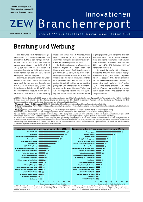 Die Beratungs- und Werbebranche gehörte im Jahr 2015 mit einer Innovationsintensität von 1,2 % zu den weniger innovativen Branchen in Deutschland. Die Innovationsausgaben stiegen von 0,83 Mrd. € (2014) auf 0,92 Mrd. €. 2016 sollen die Innovationsbudgets auf 1,01 Mrd. € angehoben werden. Für das Jahr 2017 ist ein Anstieg auf 1,07 Mrd. € geplant.
