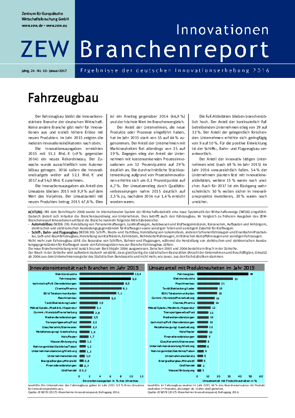Der Fahrzeugbau bleibt die innovationsstärkste Branche der deutschen Wirtschaft. Keine andere Branche gibt mehr für Innovationen aus und erzielt höhere Erlöse mit neuen Produkten. Im Jahr 2015 zeigten die meisten Innovationsindikatoren nach oben.