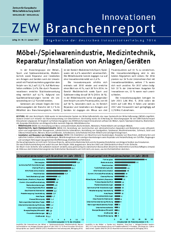 Gemessen am Umsatz liegen die Innovationsausgaben der Branche mit 3,1 % im Mittelfeld des Branchenvergleichs. Hierfür ist der Bereich Medizintechnik/Sport-/Spielwaren mit 4,4 % wesentlich verantwortlich. Die Möbelindustrie kommt dagegen nur auf eine Innovationsintensität von 1,6 %.