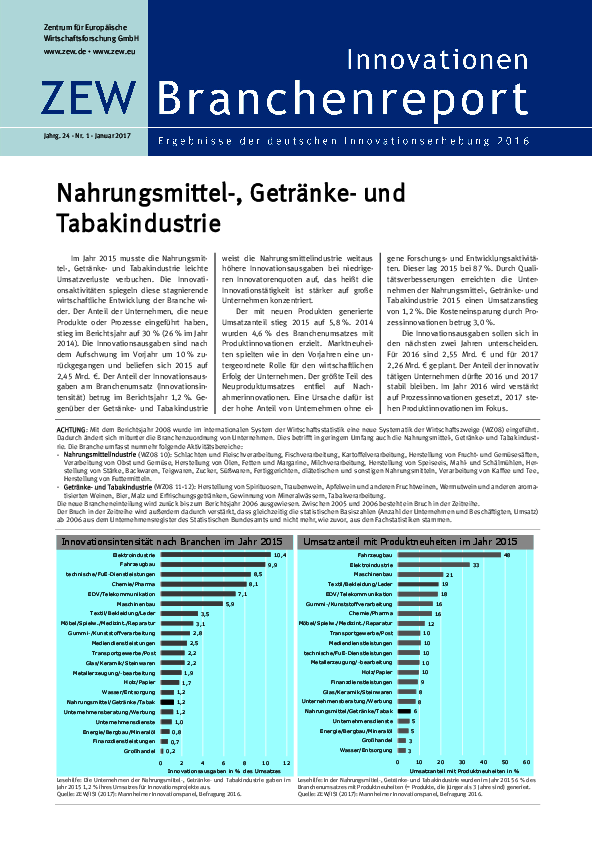 Im Jahr 2015 musste die Nahrungsmittel-, Getränke- und Tabakindustrie leichte Umsatzverluste verbuchen. Die Innovationsaktivitäten spiegeln diese stagnierende wirtschaftliche Entwicklung der Branche wider. Der Anteil der Unternehmen, die neue Produkte oder Prozesse eingeführt haben, stieg im Berichtsjahr auf 30 % (26 % im Jahr 2014). Die Innovationsausgaben sind nach dem Aufschwung im Vorjahr um 10 % zurückgegangen und beliefen sich 2015 auf 2,45 Mrd. €. Der Anteil der Innovationsausgaben am Branchenumsatz (Innovationsintensität) betrug im Berichtsjahr 1,2 %.  Gegenüber der Getränke- und Tabakindustrie weist die Nahrungsmittelindustrie weitaus höhere Innovationsausgaben bei niedrigeren Innovatorenquoten auf, das heißt die Innovationstätigkeit ist stärker auf große Unternehmen konzentriert.