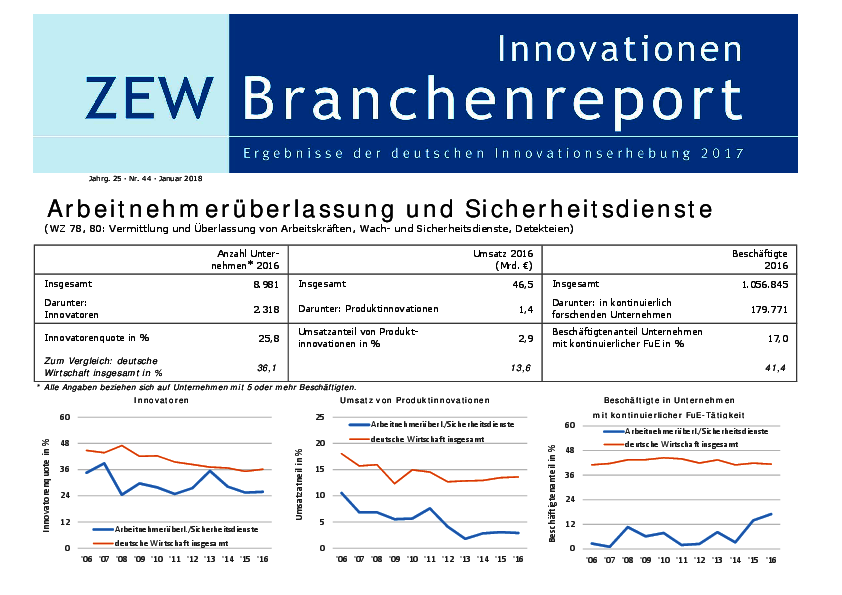 Der Branchenreport Innovation für die Branche Arbeitnehmerüberlassung und Sicherheitsdienste stellt die Innovationsleistung der Branche im Jahr 2016 dar. Der Anteil der Unternehmen mit Produktinnovationen lag bei 12 %. Die Innovationsausgaben fielen gegenüber dem Vorjahr um 33 % und betrugen somit 0,3 % des Umsatzes. Durch Prozessinnovationen konnten Kosteneinsparungen von 0,4 % erzielt werden.