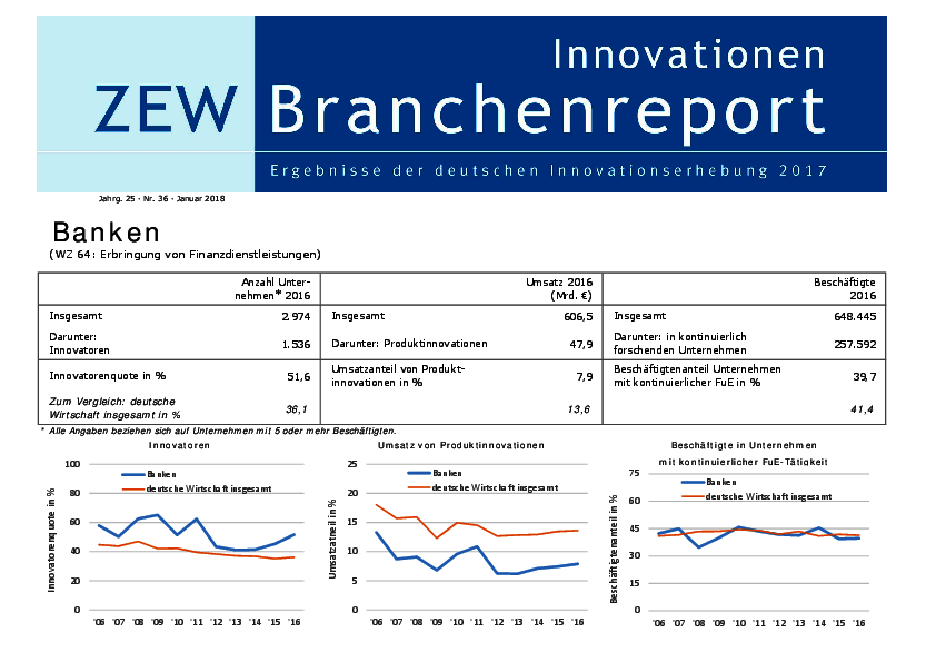 Der Branchenreport Innovation für die Branche Banken stellt die Innovationsleistung der Branche im Jahr 2016 dar. Der Anteil der Unternehmen mit Innovationen lag bei 51,6 %. Die Innovationsausgaben stiegen gegenüber dem Vorjahr um 5 %. Der Unternehmensanteil mit Produktinnovationen betrug 43 %.