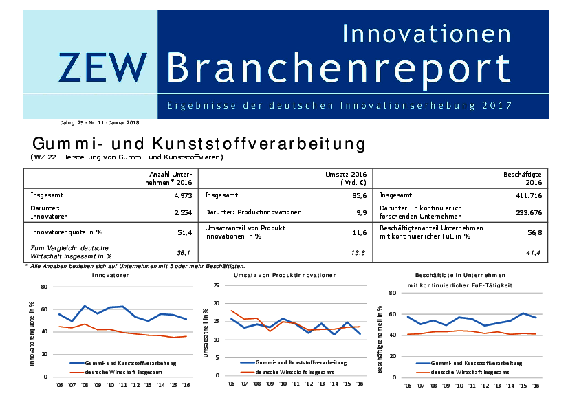 Der Branchenreport Innovation für die Branche Gummi- und Kunststoffverarbeitung stellt die Innovationsleistung der Branche im Jahr 2016 dar. Der Anteil der Unternehmen mit Innovationen lag bei 51,4 %. Die Innovationsausgaben stiegen gegenüber dem Vorjahr um 6 % und betrugen 2,48 Mrd. €. Der Umsatzanteil mit Produktinnovationen belief sich auf 11,6 %.