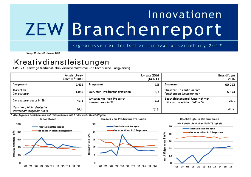 Der Branchenreport Innovation für die Branche Kreativdienstleistungen stellt die Innovationsleistung der Branche im Jahr 2016 dar. Der Anteil der Unternehmen mit kontinuierlicher Forschung und Entwicklung lag bei 16 %. 41 % der Unternehmen führten Produkt- oder Prozessinnovationen ein. Produktinnovationen leisten 9,3 % zum gesamten Umsatz der Branche. Die Innovationsausgaben lagen bei 0,25 Mrd. €, das sind 3,3 % des Branchenumsatzes.