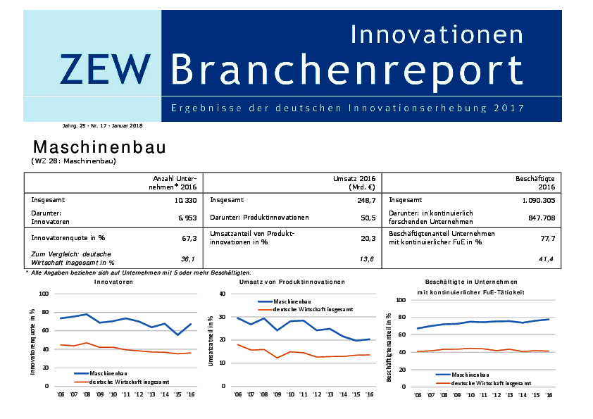Der Branchenreport Innovation für die Branche Maschinenbau stellt die Innovationsleistung der Branche im Jahr 2016 dar. Der Anteil der Unternehmen mit Innovationen lag bei 67,3 %. Die Innovationsausgaben stiegen gegenüber dem Vorjahr um 7 % und betrugen 15,35 Mrd. €. Der Umsatzanteil mit Produktinnovationen lag bei 20,3 %.