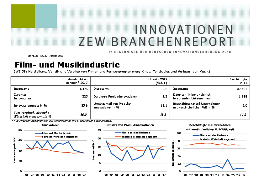 Der Branchenreport Innovation für die Branche Film- und Musikdienste stellt die Innovationsleistung der Branche im Jahr 2017 dar. Der Anteil der Unternehmen mit Innovationen lag bei 35,6 %. Die Innovationsausgaben stiegen gegenüber dem Vorjahr um 24 %. Der Unternehmensanteil mit Produktinnovationen lag bei 29 %.