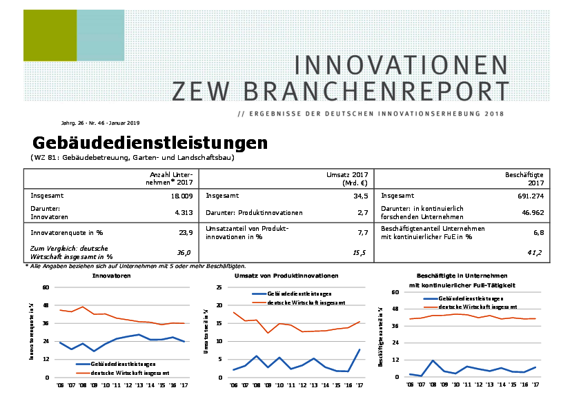 Der Branchenreport Innovation für die Branche Gebäudedienstleistungen stellt die Innovationsleistung der Branche im Jahr 2017 dar. 23,9 % der Unternehmen führten Produkt- oder Prozessinnovationen ein. Produktinnovationen leisten 7,7 % zum gesamten Umsatz der Branche. Die Innovationsausgaben blieben gegenüber Vorjahreswert von 0,35 Mrd. €. Dies entspricht 1,0 % des Branchenumsatzes.