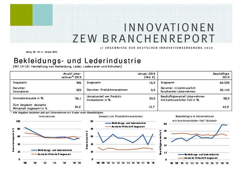 Der Branchenreport Innovation für die Branche Bekleidungs- und Lederindustrie stellt die Innovationsleistung der Branche im Jahr 2019 dar. Der Anteil der Unternehmen mit Innovationen lag bei 56,1 %. Die Innovationsausgaben fiel gegenüber dem Vorjahr um 10 % auf 0,71 Mrd. €. 14 % der Unternehmen wiesen eine kontinuierliche FuE-Tätigkeit auf. Der Beschäftigungsanteil von Unternehmen mit kontinuierlicher FuE betrug 58,0 %.
