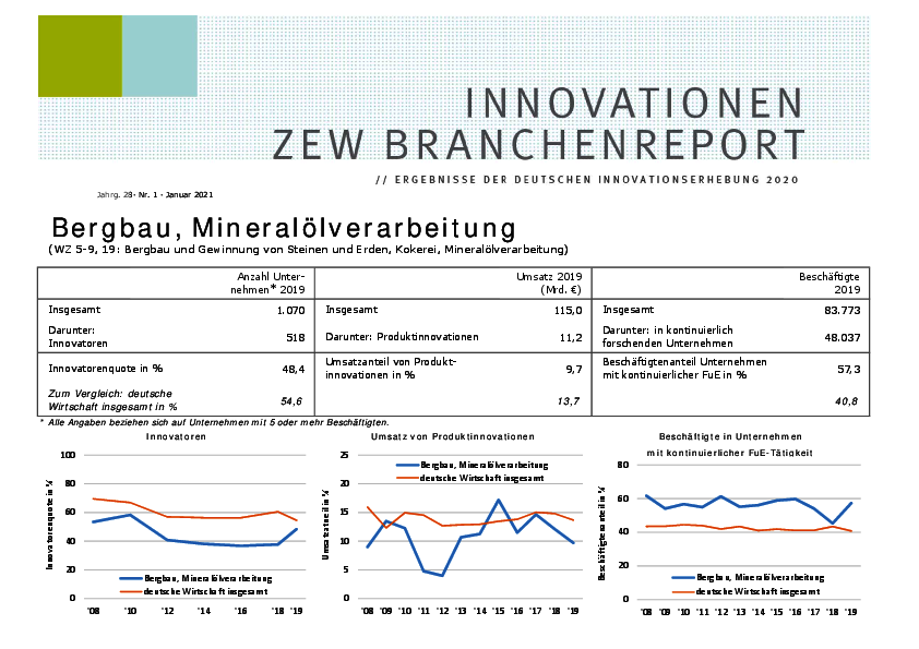 Der Branchenreport Innovation für die Branche Bergbau und Mineralölverarbeitung stellt die Innovationsleistung der Branche im Jahr 2019 dar. Der Anteil der Unternehmen mit Innovationen lag bei 48,4 %. Die Innovationsausgaben stiegen gegenüber dem Vorjahr um 19 % an. Der Umsatzanteil mit Produktinnovationen betrug 9,7 %.
