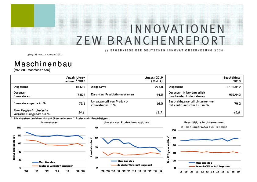 Der Branchenreport Innovation für die Branche Maschinenbau stellt die Innovationsleistung der Branche im Jahr 2019 dar. Der Anteil der Unternehmen mit Innovationen lag bei 73,1 %. Die Innovationsausgaben stiegen gegenüber dem Vorjahr um 7 % und betrugen 17,78 Mrd. €. Der Umsatzanteil mit Produktinnovationen lag bei 16 %.