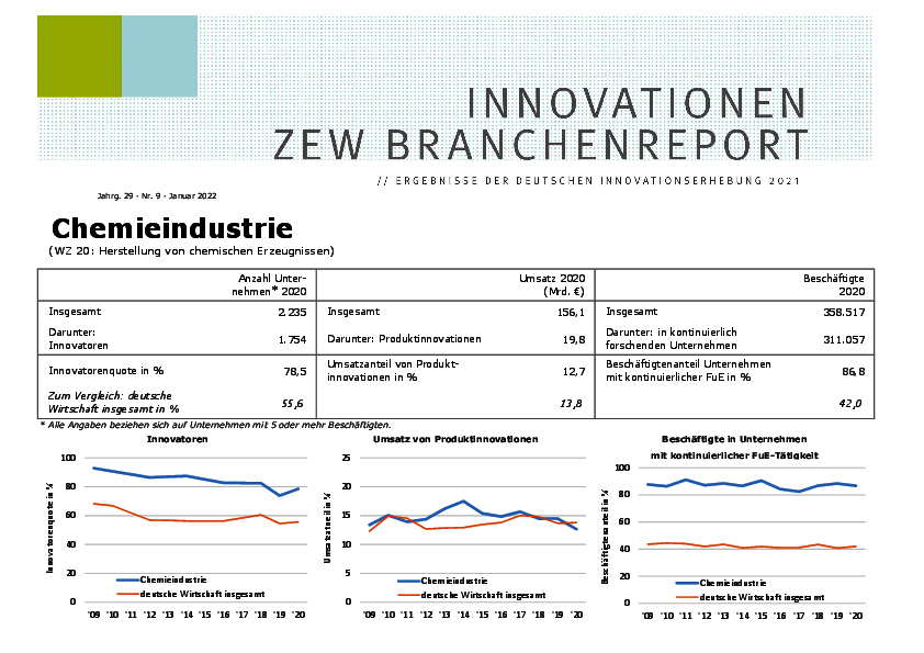 Der Branchenreport Innovation für die Branche Chemieindustrie stellt die Innovationsleistung der Branche im Jahr 2021 dar. Der Anteil der Unternehmen mit Innovationen lag bei 78,5 %. Die Innovationsausgaben stiegen gegenüber dem Vorjahr um 16 % auf 7,80 Mrd. €. Der Umsatzanteil mit Produktinnovationen betrug 12,7 %.